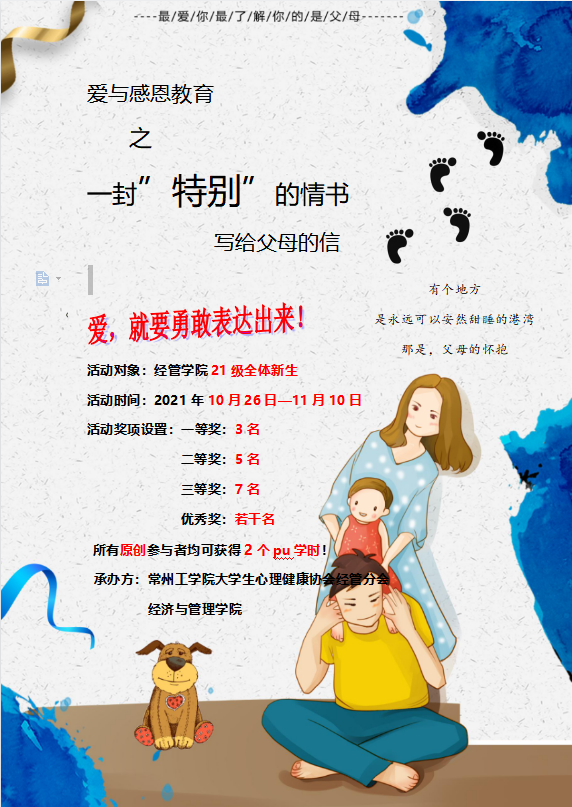 本次活动不仅为新生搭建平台把自己内心想要对父母所说之言写出来,而且还提醒新生勿忘初心,感恩父母,传扬孝道文化,此次活动的成功,亦是同学们对父母亲情的深刻解读,是家风与爱的传承。