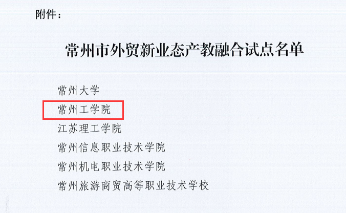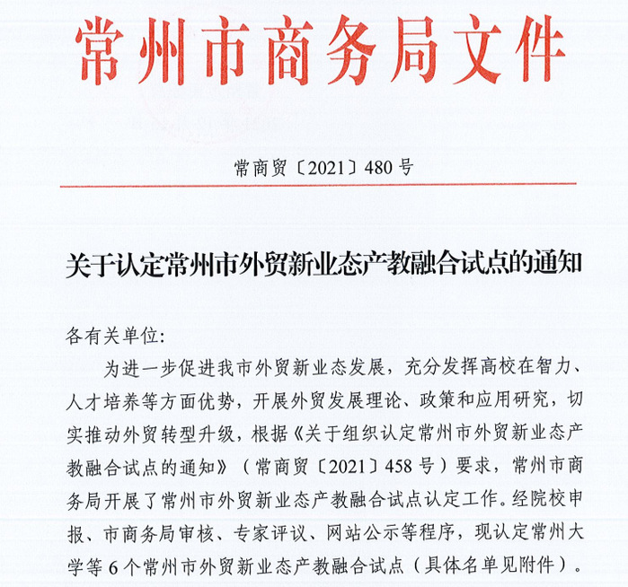 近日,常州市商务局公布了《关于认定常州市外贸新业态产教融合试点的通知》(常商贸[2021]480号),经过前期申报、市商务局审核、专家评审、网站公示的等程序,最终认定best365官方网站等6家单位为常州市外贸新业态产教融合试点单位,并在建设经费上给予大力支持。市商务局希望试点单位主动适应我市外贸企业人才需求,加强学科专业建设,紧跟外贸新业态发展潮流,为外贸稳中提质提供人才和智力支持。
