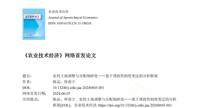 近期,公司best365官网入口注册陈品博士与农业经济学领域知名专家南京农业大学钟甫宁教授合作的研究成果《农村土地调整与分配细碎化——基于诱致性制度变迁的分析框架》在农业经济学权威期刊《农业技术经济》首发。该研究围绕我国农村土地分配细碎化的现实,重新审视了土地调整对细碎化的影响,提出了在规模经济的诱导下土地调整对细碎化的不同效应,该研究成果为土地调整领域的研究做出了边际贡献,为我国农村土地延包工作的开展及推动地块层面规模化分配与经营提供了相关政策的制定依据。