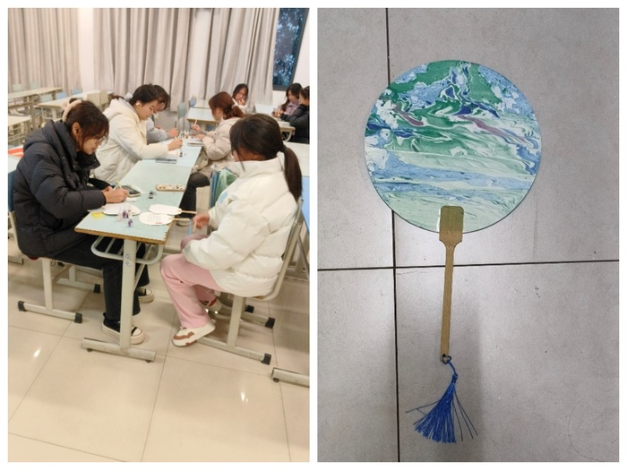 活动现场,同学们通过观看社团指导老师指导色彩搭配、网络视频学习漆扇入水方式,学习制作漆扇的各种技法,为亲手制作美丽的漆扇打牢基础。在其后的体验环节中,社团成员大展身手,同学们构思颜色搭配和上色技巧,把几种颜色的大漆滴入水中,轻轻搅动,让颜色在水面上自然散开,然后再慢慢上提,让大漆留下水波纹路,便完成了一把把极具国风审美的漆扇。