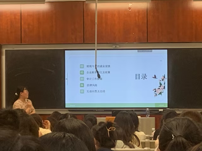 在讲座中,殷庭兰首先介绍了财税专业的就业前景;其次讲述了企业财务岗位及核算流程,审计工作流程;接着分享了实际的财务工作法律风险案例,提醒同学们要注意职场的自我风险防范。